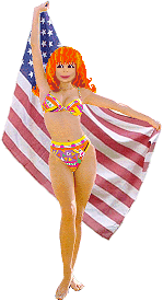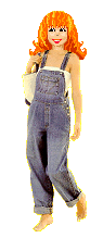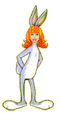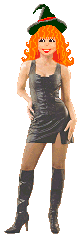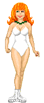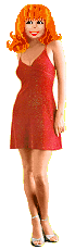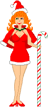This is how I appeared at Christmas, 1998, dressed as Mrs. Santa Claus. You'll notice it's not really an entirely new outfit from the first Halloween one; the colors and some of the details have been changed, that's all. Gene began to experiment with .gif animation and that's how I acquired the wink. You'll also notice that some of the "jaggies" on my legs have been smoothed out. |