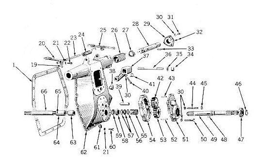 Dear Meli, I am new to restoring old tractors, I have asked a few people trying to find out what is a Rockshaft? Could you give me an answer? Hi ya... The "rockshaft" is the shaft in the powerlift at the back of the tractor. (See the illustration below) The lift itself is part #62, and the shaft is part #28. There are two shafts, one on each side. They rotate or "rock" about 90 degrees, and by attaching levers, "arms", or linkage to them, you can lift various implements. |