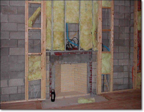 | Gene did some of the preliminary upfitting of the cabinets, mantle and paneling that goes on this wall. Then Gene and David took all of the parts out to the island. The first picture is what the room looked like when they arrived there. |